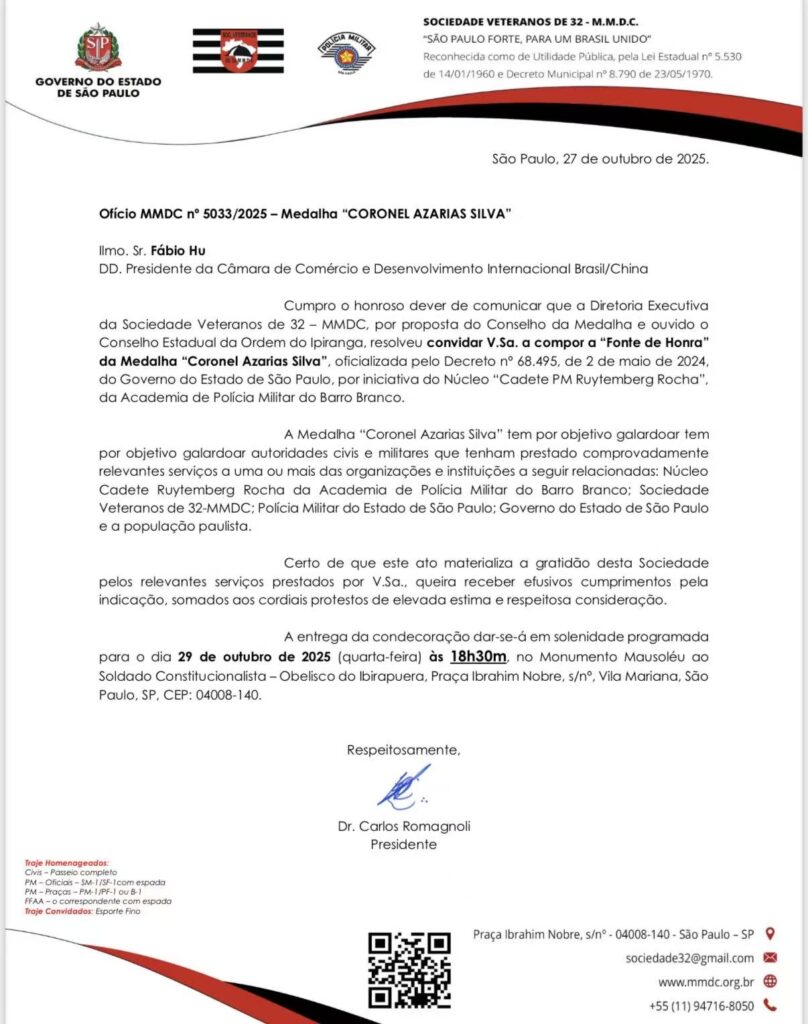Presidente e Vice-presidente da Câmara de Desenvolvimento Internacional Brasil-China, Fabio Hu e Edenilson, são agraciados com a “Medalha Coronel Azaléias” do Estado de São Paulo